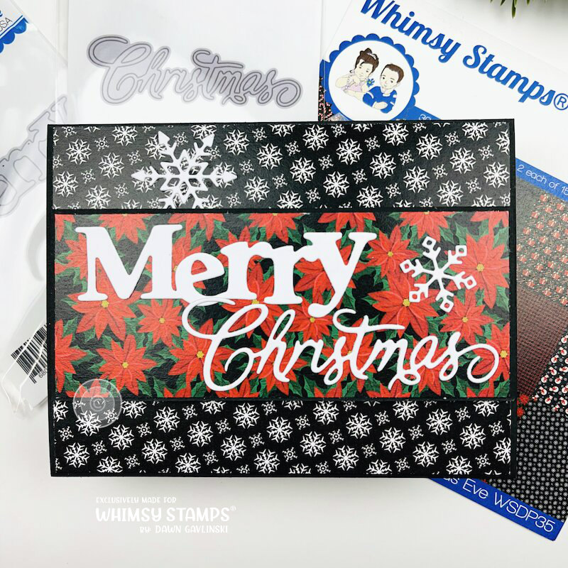 Today I am showcasing Whimsy's Christmas Eve 6x6 Paper Pack, Merry Large Word Die, Christmas Large Word Die and Elegant Snowflakes and Border Die.