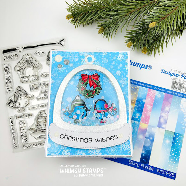 Today I am showcasing Whimsy Stamps Tweetie Pie Clear Stamp Set, Shaker Maker Glitter Globe Die, Happy Sayings and Blurry Flurries 2 Confetti Mix