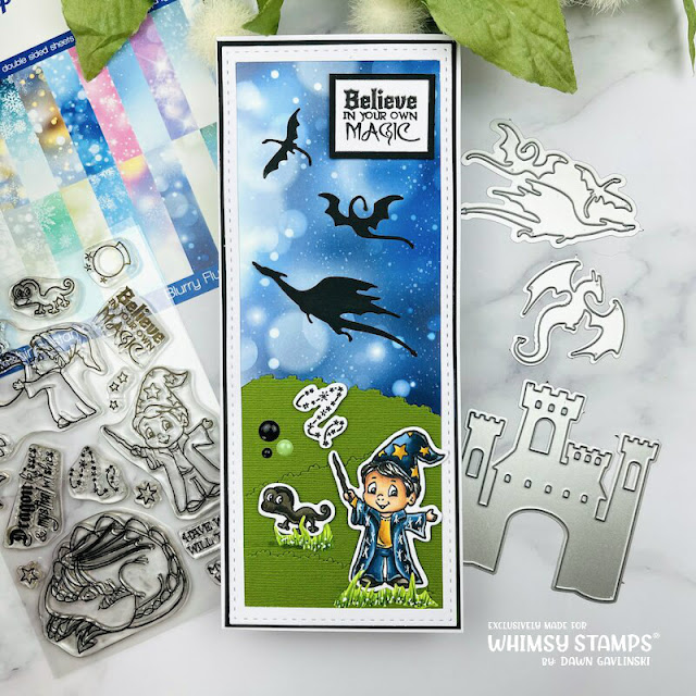 Today I am showcasing Whimsy Stamps Build-a-Castle Die Set, Wizard in Training Stamp Set, Wizard in Training Outline Die Set, Slimline Meadow Die Set, No-See All Seasons Tree Die Set and Blurry Flurries 6 x 6 Paper Pack.
